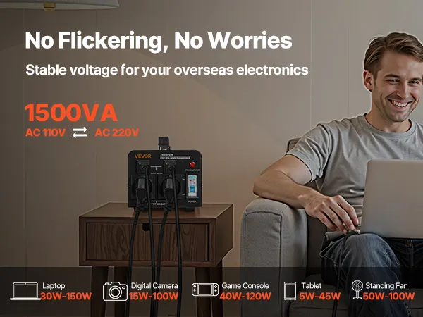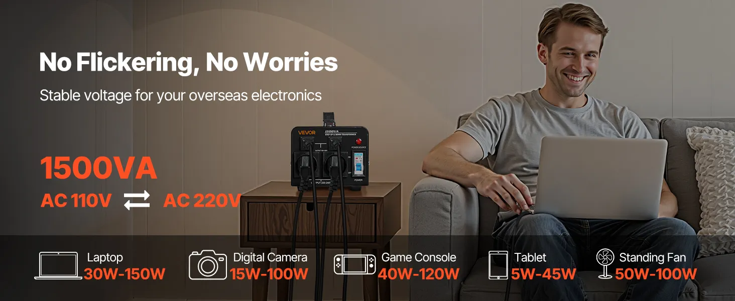 Q: What power rating should I choose for my voltage converter? A: Check your device's power rating (in watts) and ensure the converter's rated power is equal to or greater than your device's power. If your devices total 300W, we recommend choosing a converter rated at 500VA or higher for more secure operation.