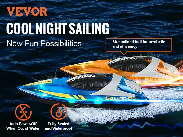 Dazzling RC Boat: Experience night-time sailing fun with this sleek, stylish remote control boat! Designed to be fully waterproof and durable, it's perfect for safe summer adventures. The special auto power-off feature when out of water keeps things safe and secure. Let your kids enjoy thrilling water play all night long!
