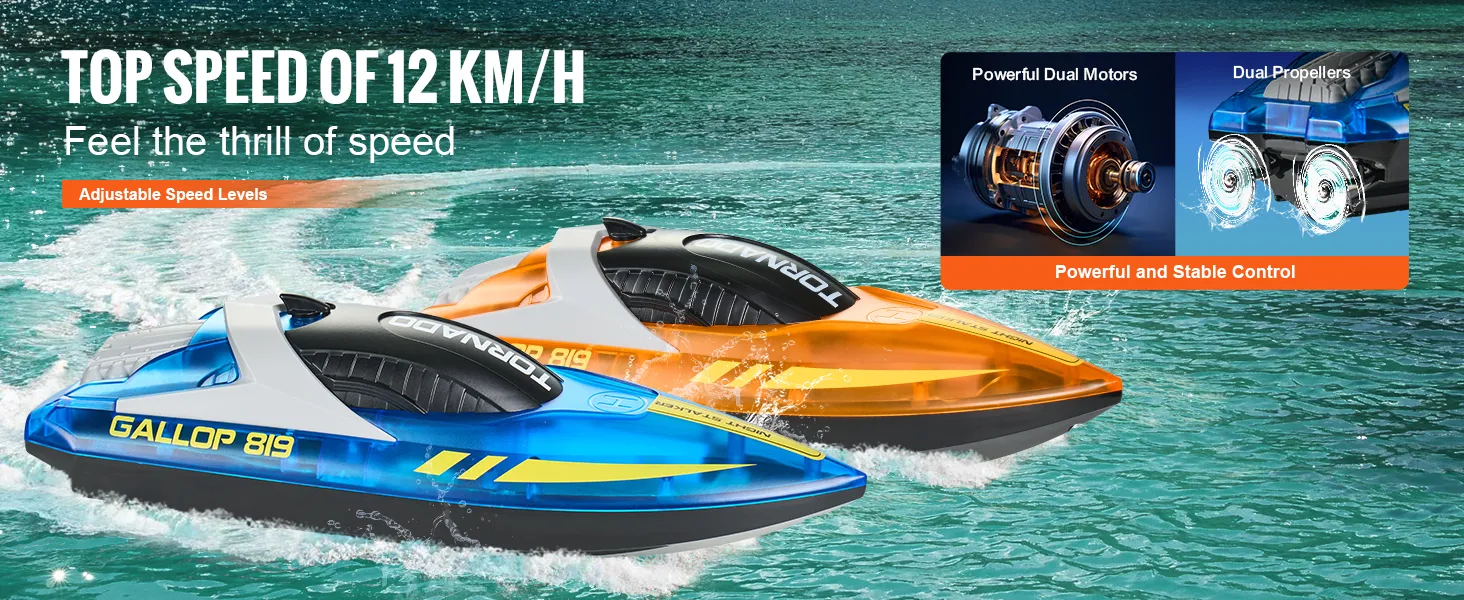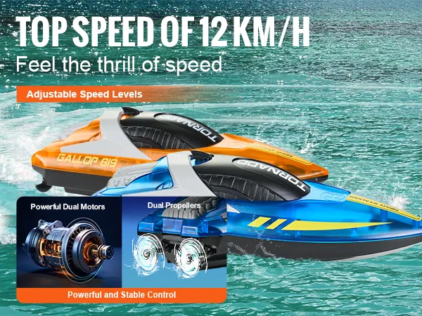 Speedy Fun: This remote boat zooms across the water at speeds up to 12 km/h, thanks to its dual motors and propellers. Whether racing or exploring, it's stable and powerful, adding excitement to every water adventure.