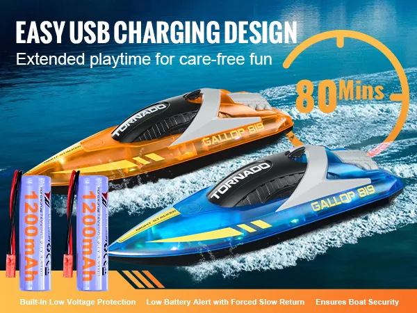 Easy Charging & Long Playtime: Featuring USB charging and a 1200mAh dual-battery system, this kids remote control boat provides up to 80 minutes of playtime. Perfect for outdoor fun—just bring a power bank to keep the adventure going all day!