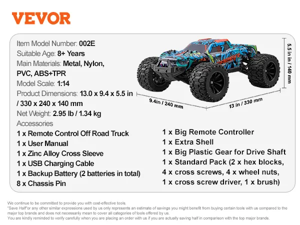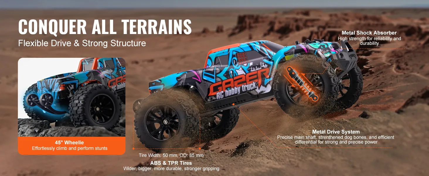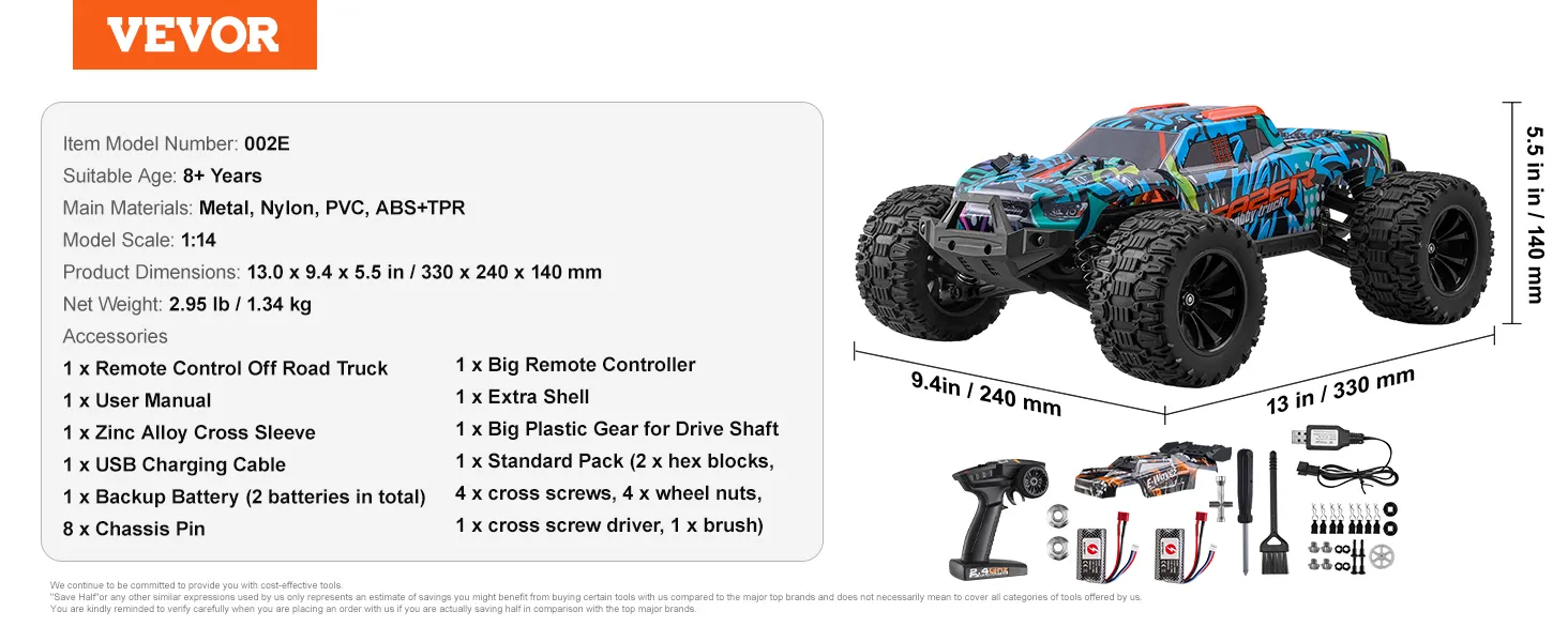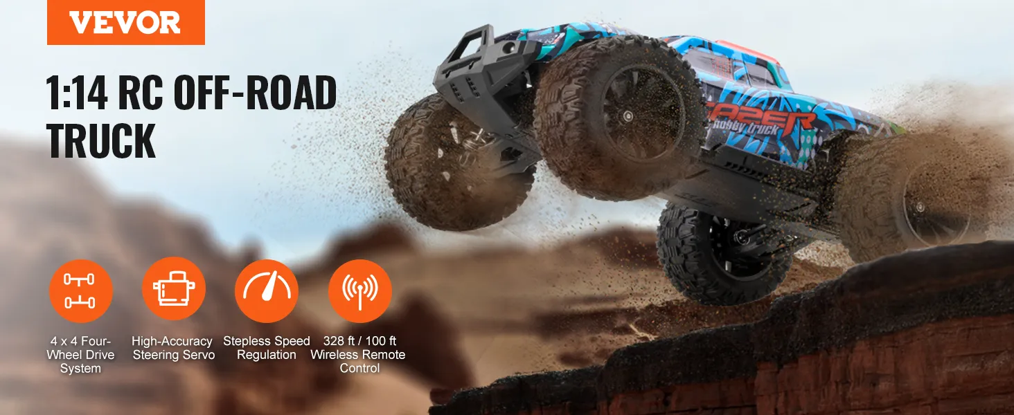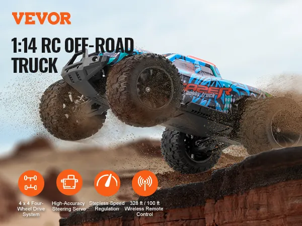 De VEVOR RC-terreinwagen op schaal 1:14 is voorzien van een metalen aandrijfas, een borstelloze motor van 30.000 tpm, traploze snelheidsregeling en banden met hoge grip om elk terrein te overwinnen.
