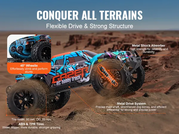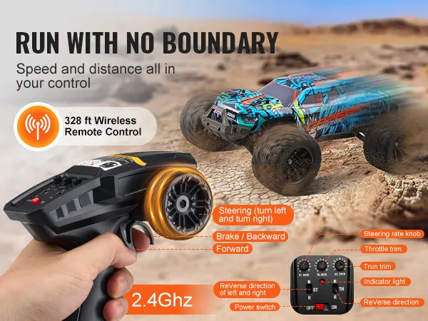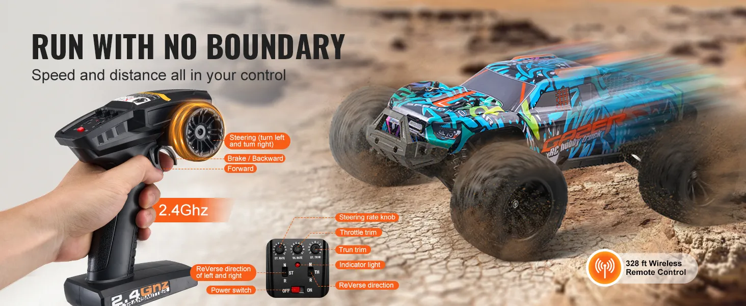Het draadloze bedieningsbereik is 100-150 meter, waardoor u bewegingsvrijheid heeft. De snelle motor van 30.000 tpm zorgt voor sterke prestaties en kan met gemak verschillende offroad-uitdagingen aan.