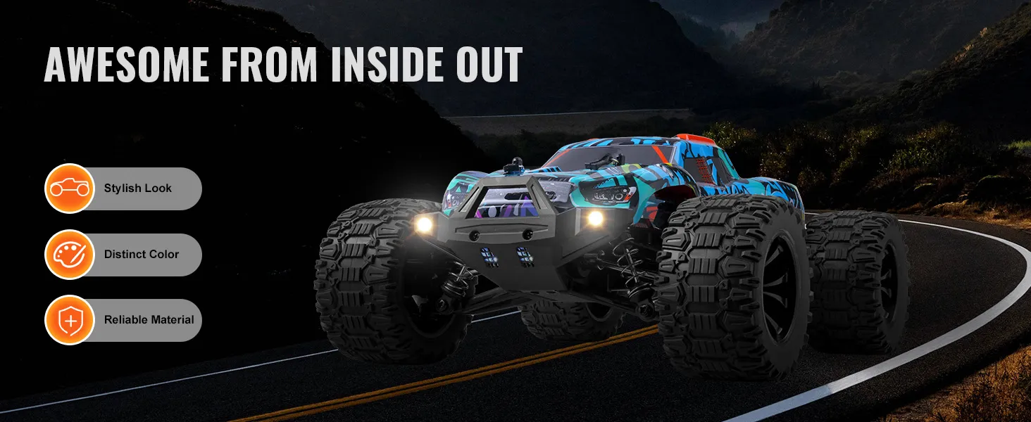 Traploze snelheidsregeling: van langzaam racen tot racen op hoge snelheid (tot 42 km/u), de traploze snelheidsregeling van deze 4WD offroad RC-auto is perfect voor elk kind, van beginners tot ervaren racers. Je kunt naar eigen inzicht de juiste snelheid kiezen voor een veilige of spannende race.