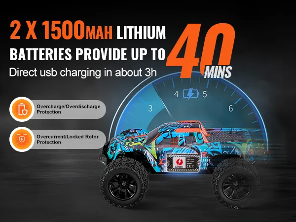 Uitgerust met 2 oplaadbare batterijen biedt deze off-road RC-truck een indrukwekkende looptijd van maximaal 40 minuten, waardoor kinderen volop kunnen genieten van hun rijavonturen.