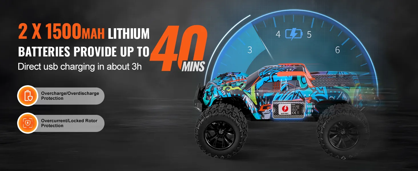 Minder opladen, langer raceplezier: met twee lithiumbatterijen van 1500 mAh levert deze off-road RC-truck sterke en duurzame prestaties, waardoor kinderen tot 40 minuten raceplezier kunnen beleven. Met een gemakkelijk toegankelijke USB-poort voor diverse voedingen (waaronder powerbank) en een snellaadfunctie kan het terreinvoertuig in slechts ongeveer 3 uur weer op het circuit zijn.