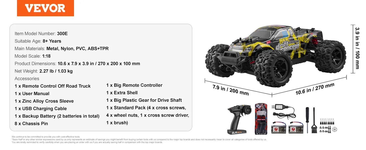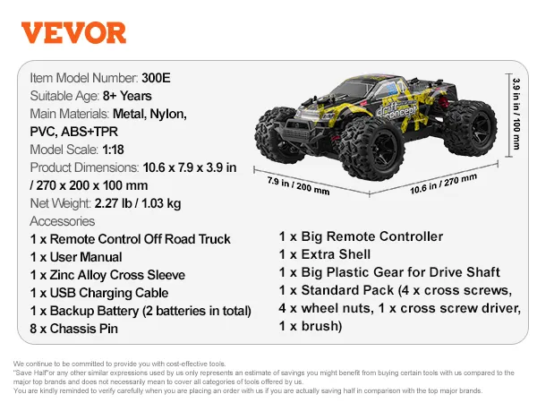 Strong Off-road Capability: VEVOR 1:18 remote control car is equipped with four-wheel drive system, sturdy metal drive shaft, 20,000 RPM super speed motor, and high-grip rubber tires, showing extraordinary off-road capability to cope with all terrains - grass, slopes, gravels, mud and sand.