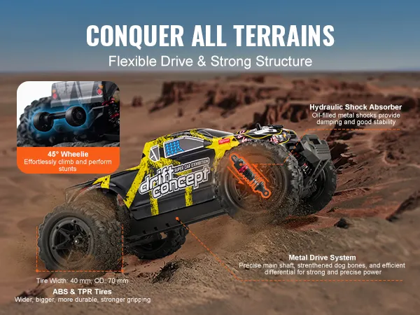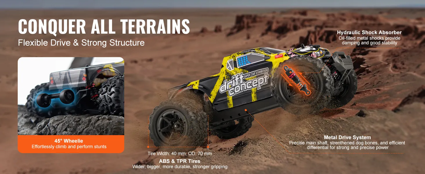 Driving Fun: Upgraded with the wheelie bar, this RC off-road car can lift its front wheels up to 45°, maintaining stability for awesome stunt performance. Combined with 45° steering angle, high-precision servo, and hydraulic shock absorber, it navigates sharp turns, climbs steep slopes, and handles rough terrains with ease, delivering an unmatched racing experience.
