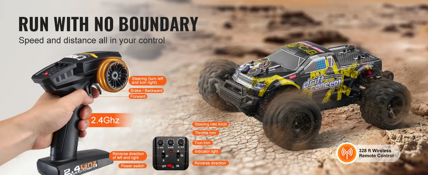Better Experiences: With IPX4 waterproof rating, 328 ft long-range remote control, high-precise main shaft, strengthened dog bone, efficient differential, front lights, and durable nylon & carbon steel chassis, every thoughtful detail is designed to create the perfect hobby RC truck for kids, providing them with more exciting adventures.