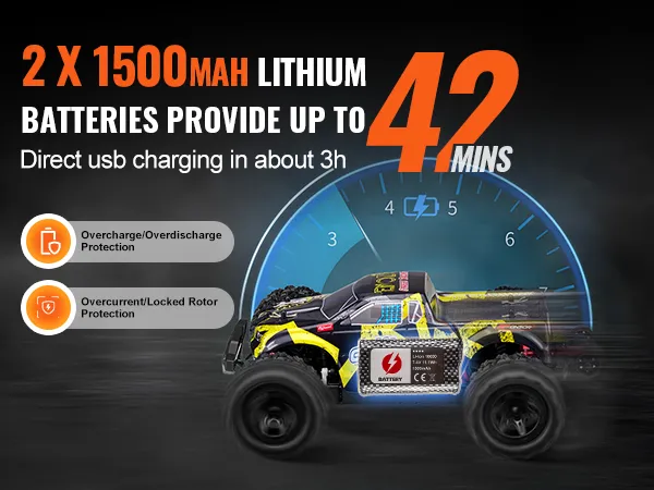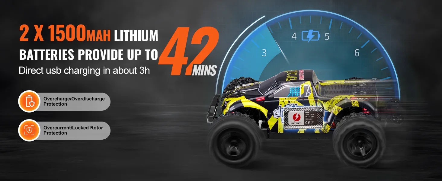 Less Charging, Longer Racing Fun: Featuring two 1500mAh lithium batteries, this all-terrain RC truck delivers strong and lasting power, allowing kids to enjoy up to 42-min of racing fun. With an easily accessible USB port for various power supplies (including power bank) and fast charging feature, the off-road car can get back on track in about just 3 hours.
