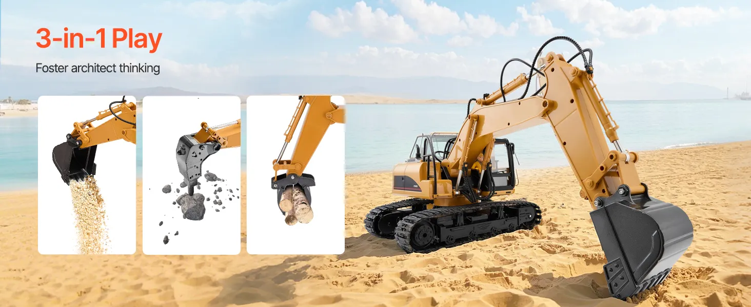 Our RC excavator comes with a bucket, pickaxe, and claw, each with independent control. It simulates movements like digging, moving, and pushing, providing a real excavator experience while engaging kids and boosting their creativity.
