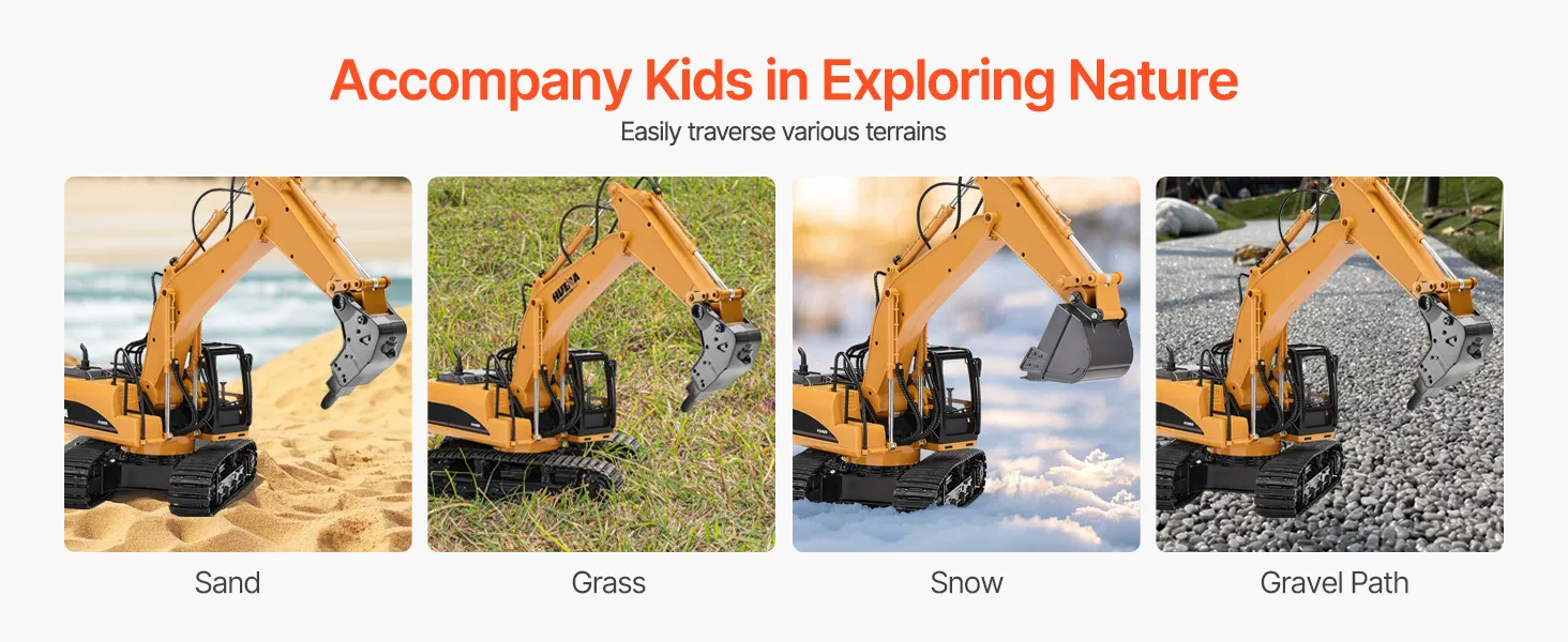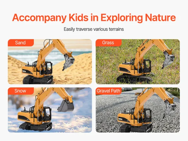 Rubber Tracks: The RC excavator is durable and wear-resistant. Its tracks provide excellent grip and can drive on various rough terrains, including carpets, beaches, grass, and snow, encouraging kids to explore the outdoors and connect with nature.