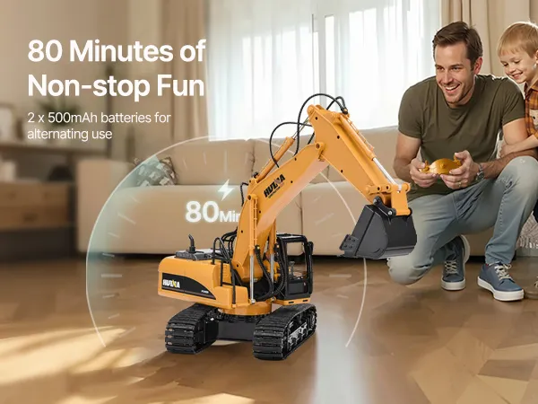 Long Battery Life: Our RC excavator for kids includes two 500mAh rechargeable batteries, allowing for up to 80 minutes of playtime. With a quick battery swap, kids can continue having fun outdoors.