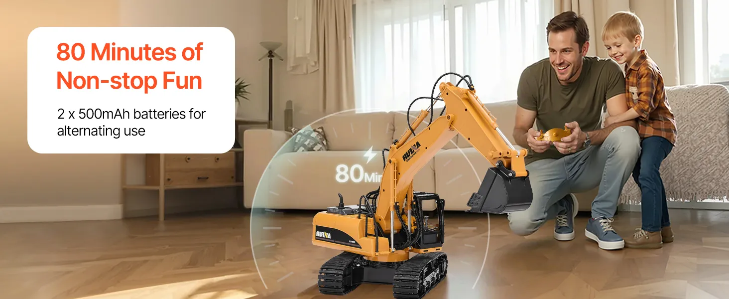 Two 500mAh batteries provide 80 minutes of playtime, with easy swaps for extended outdoor fun. This allows the remote control excavator toy to perform even more, giving you greater enjoyment. The batteries are secure, durable, and rechargeable for extended use.