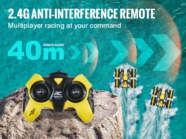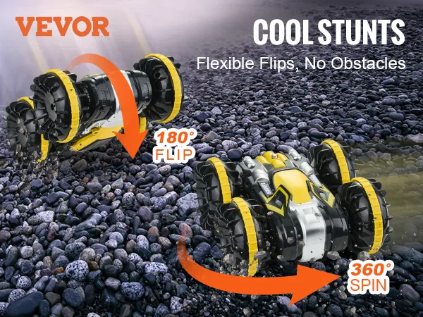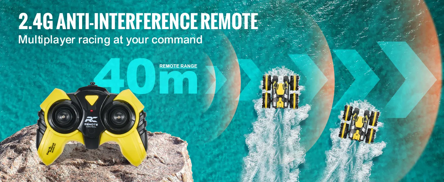 Coole stunts: bereid je voor op actie met geweldige 180°-flips en 360°-spins! Deze amfibische RC-autoboot biedt spannende stunts en een spannende rijervaring, of je nu op het land rijdt of over het water zweeft.