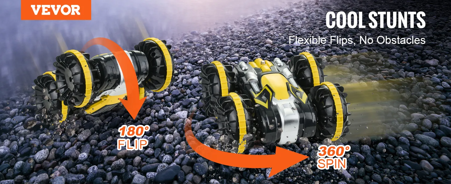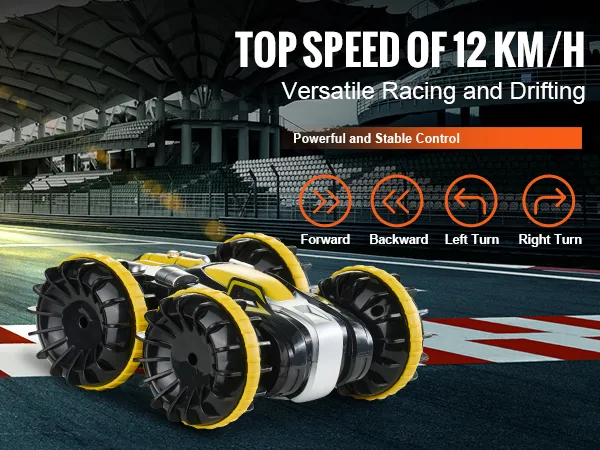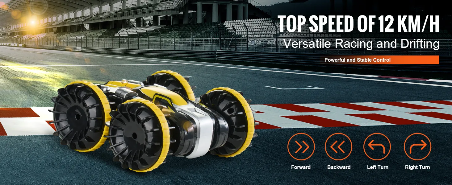 Snelle driften: bereik snelheden tot 12 km/u met krachtige prestaties. Deze amfibische stuntauto zorgt voor soepele driften in alle richtingen, waardoor kinderen op een leuke en opwindende manier kunnen genieten van snelheid en tegelijkertijd hun coördinatie- en denkvaardigheden verbeteren.
