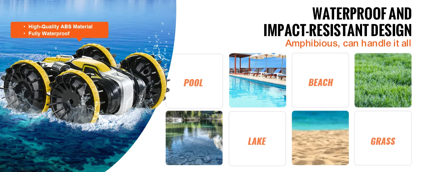 Deze amfibieauto is gemaakt van duurzaam ABS-materiaal en is volledig waterdicht. Hij is klaar voor elke uitdaging, of je nu op het water of op het land speelt. Hij is gebouwd om door te gaan, ongeacht wat hem in de weg staat.