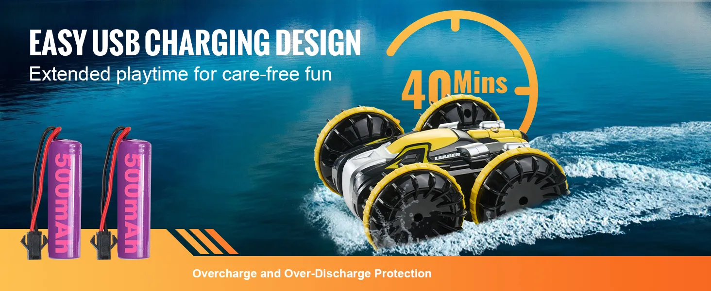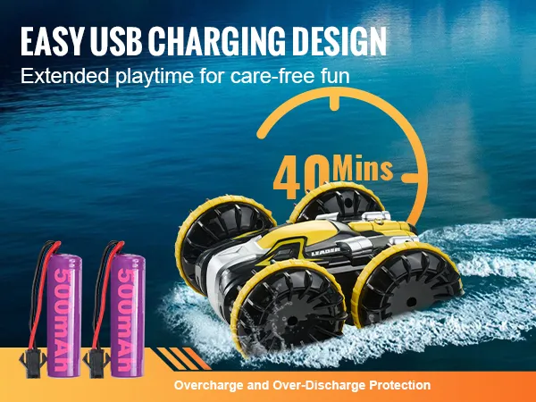 Verlengde speeltijd: Geniet van maximaal 40 minuten speeltijd met een dubbel batterijsysteem van 500 mAh en opladen via USB. De overlaad- en overontladingsbeveiliging van de RC-autoboot zorgt voor veilig gebruik. Perfect voor buitenplezier – neem gewoon een powerbank mee om het avontuur de hele dag door te laten gaan!