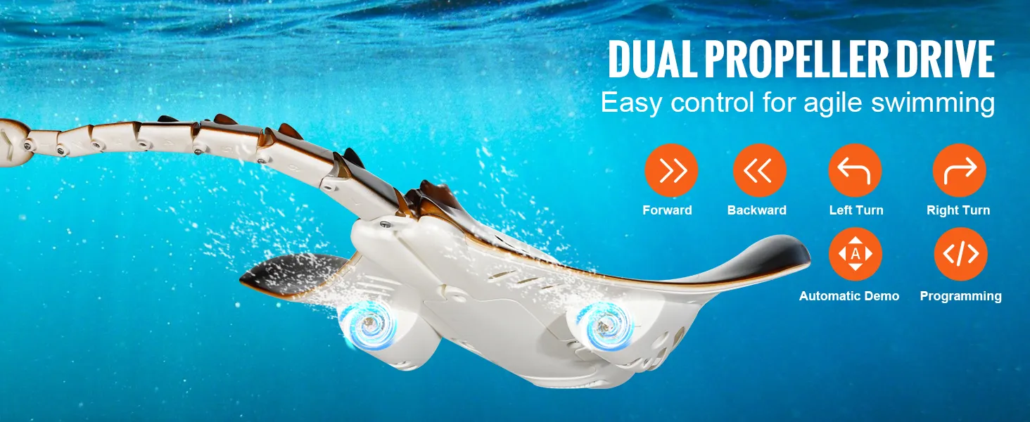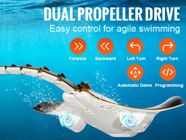 Veelzijdige beweging: Dankzij de krachtige dubbele propellers kan het mantarogspeelgoed met afstandsbediening gemakkelijk vooruit, achteruit, links en rechts zwemmen. Het is ontworpen voor extra spanning en maakt elke gamesessie avontuurlijk en vermakelijk.