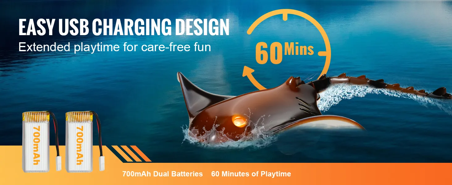 Dit mantarog-speelgoed met afstandsbediening heeft een USB-oplaadontwerp en twee batterijen die je meer dan 60 minuten speeltijd geven. Neem gewoon een powerbank mee en het waterplezier kan onafgebroken doorgaan.
