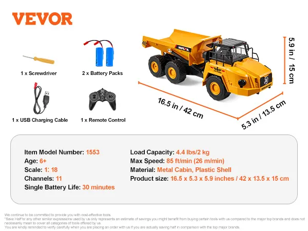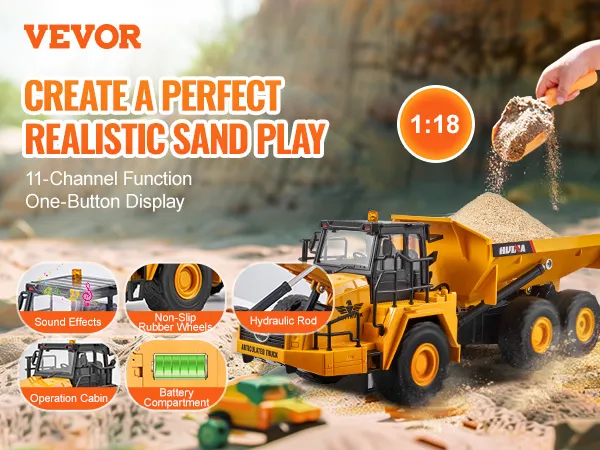 11-Channel Fun: This RC dump truck is packed with 11 channels of control for realistic play. Features like a truck bed, battery compartment, and simulated hydraulic rod make it feel just like the real thing. Plus, with simulated sounds and non-slip rubber wheels, it's loads of fun!