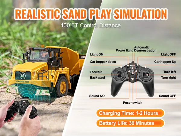 100 ft Remote Range: With a remote control range of up to 100 feet, kids can steer and operate the remote dump truck from a distance, improving their coordination and time management skills. Enjoy easy, long-distance control and quick recharging—just 3-4 hours to charge for up to 30 minutes of playtime.