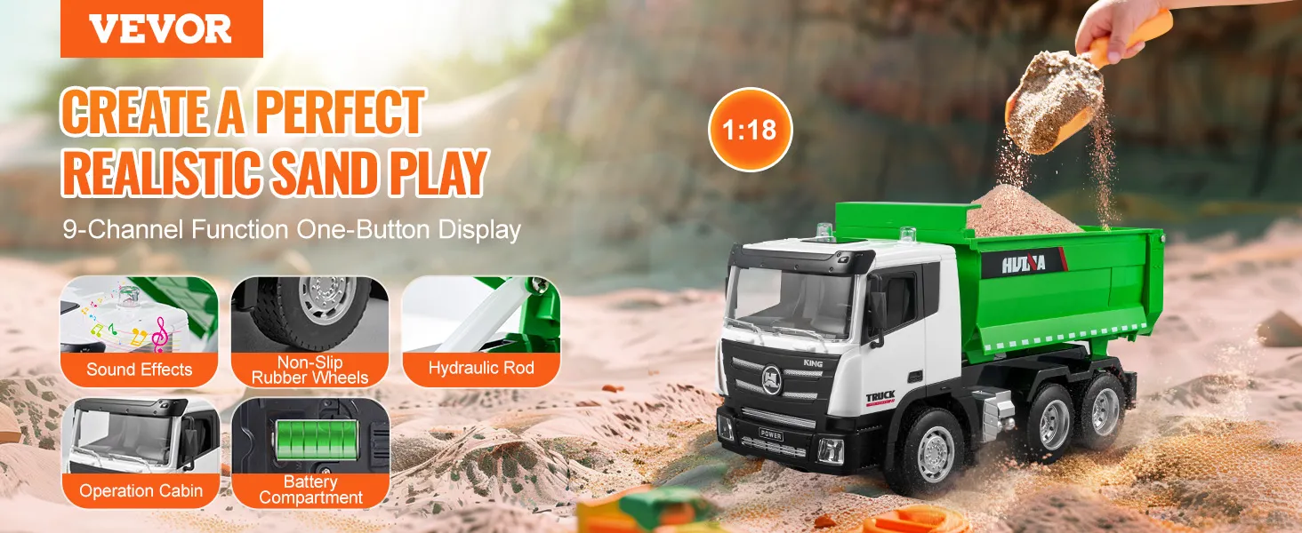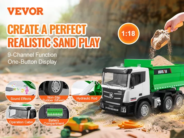 9-Channel Fun: This RC dump truck is packed with 9 channels of control for realistic play. Features like a truck bed, battery compartment, and simulated hydraulic rod make it feel just like the real thing. Plus, with simulated sounds and non-slip rubber wheels, it's loads of fun!