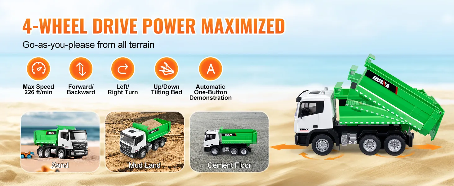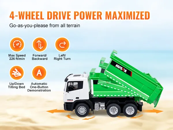 Powerful 4WD Performance: The RC dump truck toy's strong 4-wheel drive lets it tackle grass, roads, and sand without breaking a sweat. On smooth surfaces, it can zoom along at speeds up to 226 ft/min (69 m/min), making every ride thrilling.