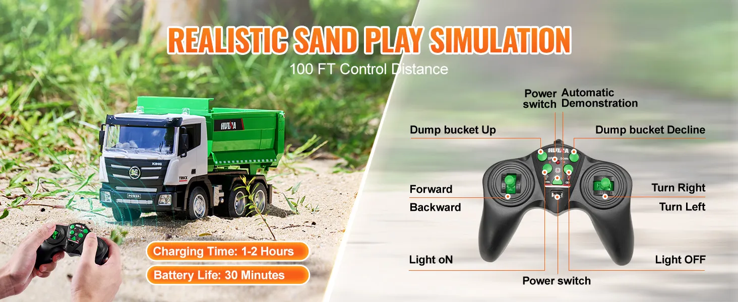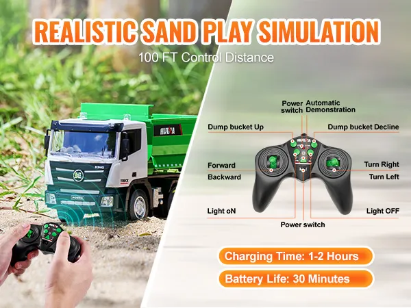 100 ft Remote Range: With a remote control range of up to 100 feet, kids can steer and operate the remote dump truck from a distance, improving their coordination and time management skills. Enjoy easy, long-distance control and quick recharging—just 1-2 hours to charge for up to 30 minutes of playtime.