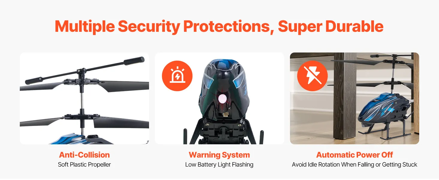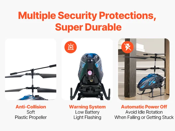 Veilig en duurzaam: de helikopter is gemaakt van PVC, aluminiumlegering en flexibele ABS-propellers en is daardoor stevig en schokbestendig. De automatische uitschakelfunctie beschermt de interne componenten tegen schade bij een crash, verlengt de levensduur en zorgt voor veilig spelen.