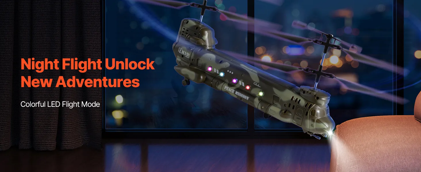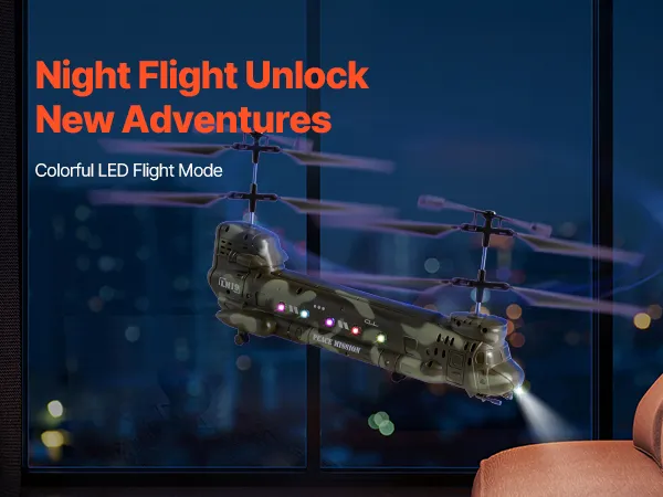 Leuke nachtvlucht: dankzij meerdere led-lichteffecten ziet de op afstand bestuurbare helikopter er fantastisch uit tijdens nachtvluchten en geeft hij veiligheidswaarschuwingen wanneer de batterij bijna leeg is. Leuk voor binnen en buiten.