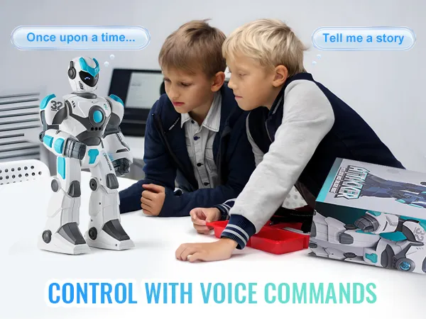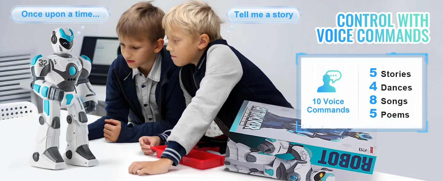 Je op afstand bestuurbare robotvriend luistert naar je stem! Met 10 verschillende commando's kan hij verhalen vertellen, dansen, zingen en zelfs gedichten voordragen. Zeg gewoon het woord en het plezier begint!