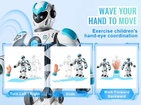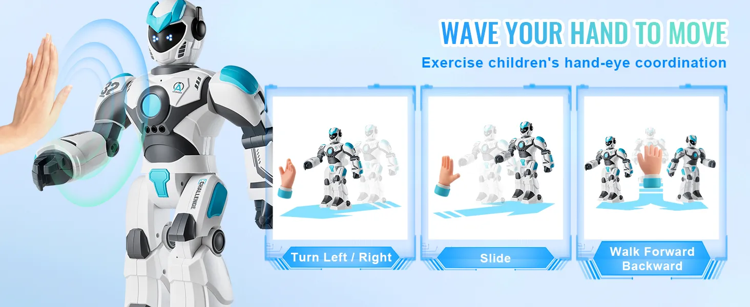 Zwaai met uw hand en zie hoe de RC-robot uw opdrachten volgt! Het beweegt naar links en rechts en glijdt moeiteloos, waardoor kinderen hun coördinatie en creativiteit kunnen verbeteren.
