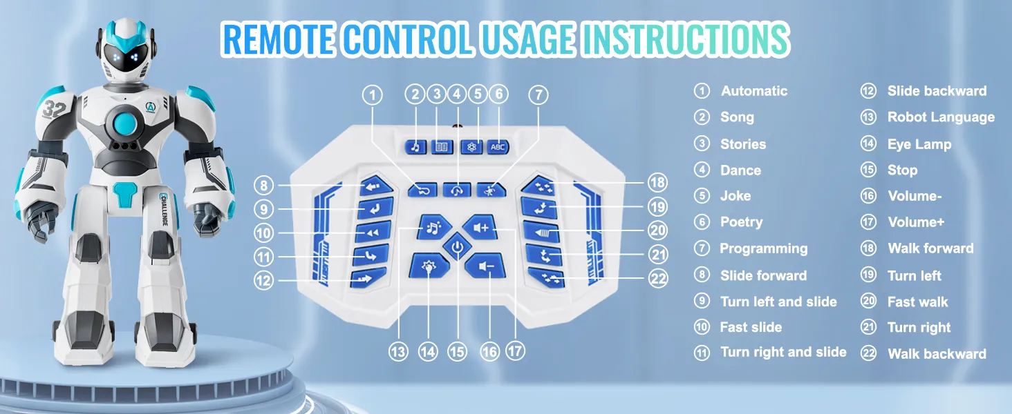 Gebruik de afstandsbediening om het robotspeelgoed met eenvoudige commando's te besturen. Programmeren is een fluitje van een cent, waardoor het voor kinderen gemakkelijk en leuk wordt om de robot precies zo te bewegen als zij willen.