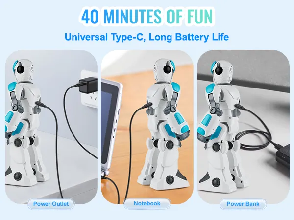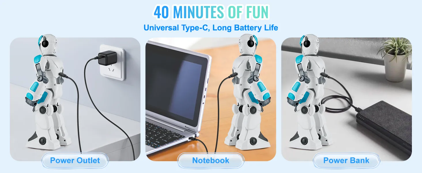 Speel langer zonder je zorgen te maken over de batterij! Geniet van maximaal 40 minuten actie en snel opladen met de Type-C-poort. Hierdoor is de kinderrobot compatibel met meer stroombronnen en kan hij eenvoudig worden opgeladen.