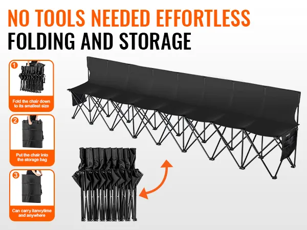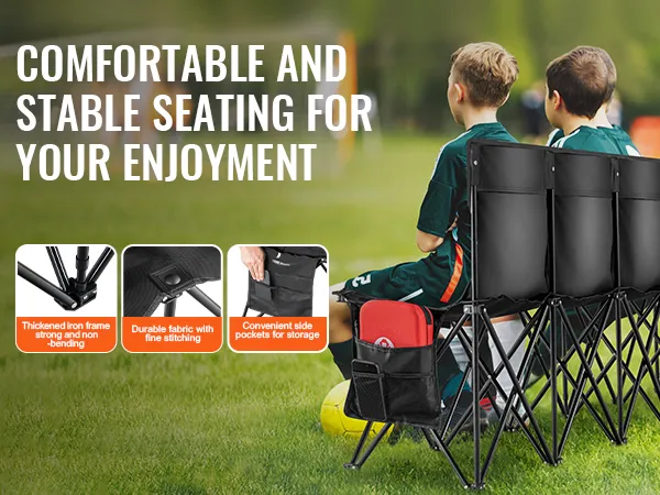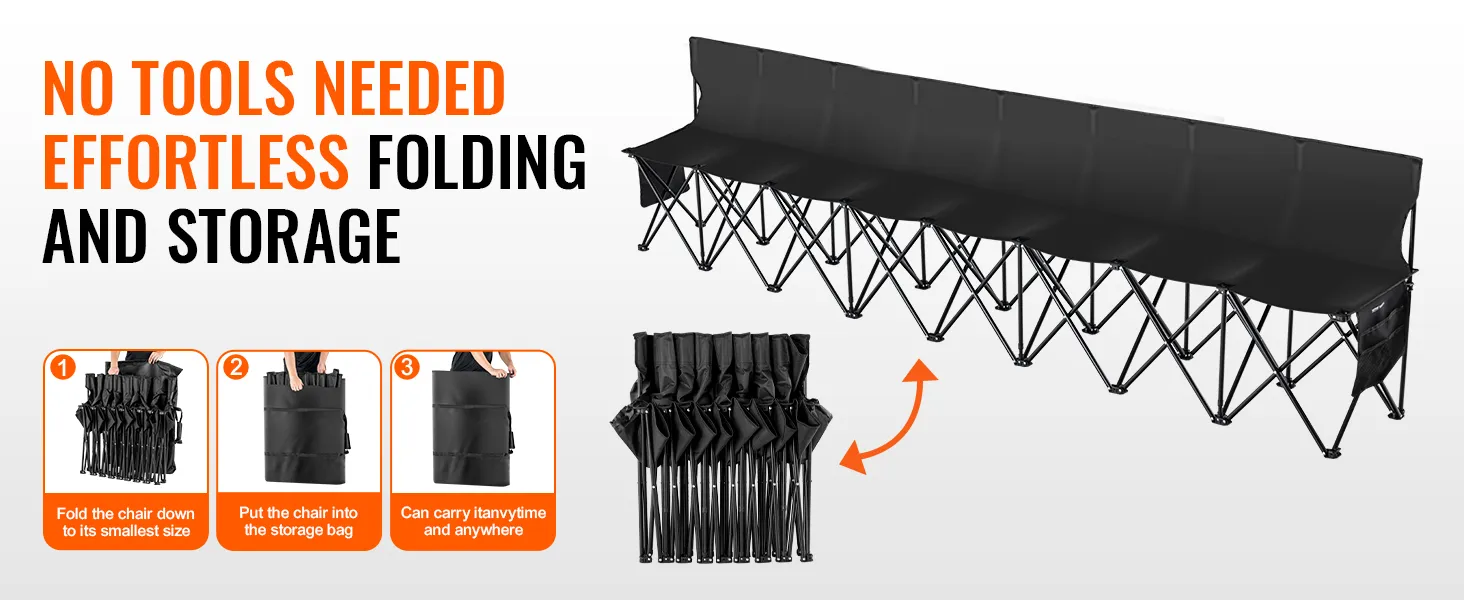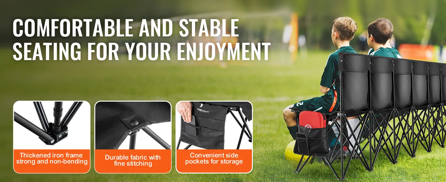 De VEVOR 8-zits draagbare opvouwbare bank heeft zijzakken. Deze zakken zijn perfect voor het opbergen van benodigdheden tijdens sportevenementen. U kunt items zoals telefoons, sleutels en EHBO-dozen binnen handbereik houden. De zijzakken dragen bij aan het gemak van de bank. Ze helpen u om uw spullen georganiseerd en veilig te houden. Deze functie is vooral handig voor coaches en teamleden. Het stelt u in staat om gemakkelijk toegang te krijgen tot belangrijke items zonder uw stoel te verlaten. De zijzakken maken de bank veelzijdiger en praktischer. Geniet van het extra gemak van opbergmogelijkheden op uw draagbare bank.