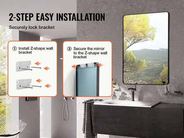 This wall mounted makeup mirror’s Z-shaped wall bracket streamlines installation, minimizing the need for pre-drilled holes or concerns about wall damage. With just two simple steps, it mounts securely in place.