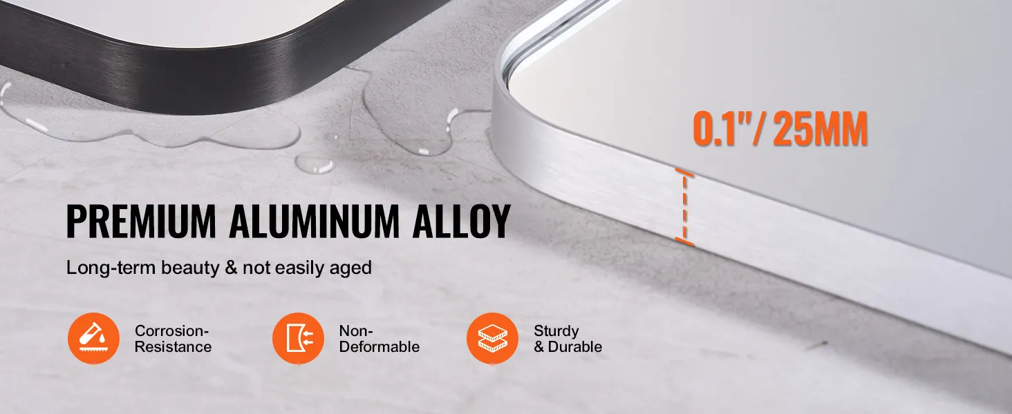 Crafted from high-quality aluminum alloy, the mirror’s lightweight frame is corrosion-resistant and retains its shine in wet spaces like bathrooms, offering long-lasting durability with a sleek, modern look.