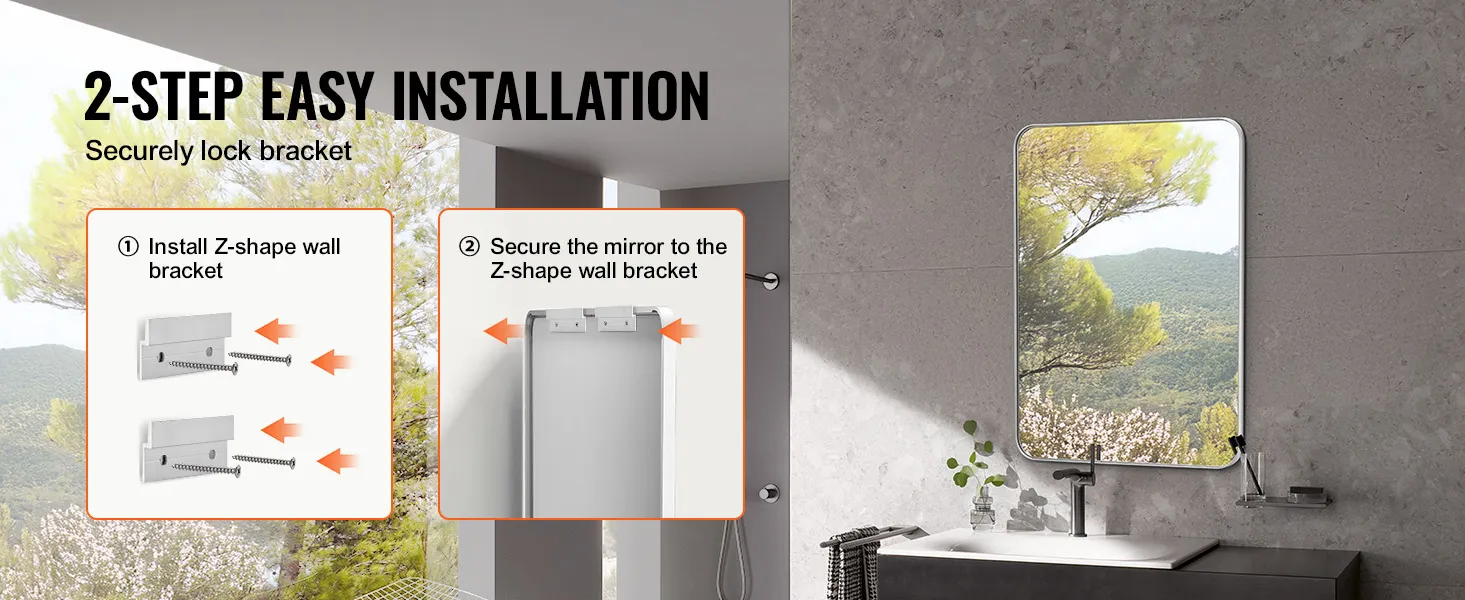 This wall mounted makeup mirror’s Z-shaped wall bracket streamlines installation, minimizing the need for pre-drilled holes or concerns about wall damage. With just two simple steps, it mounts securely in place.