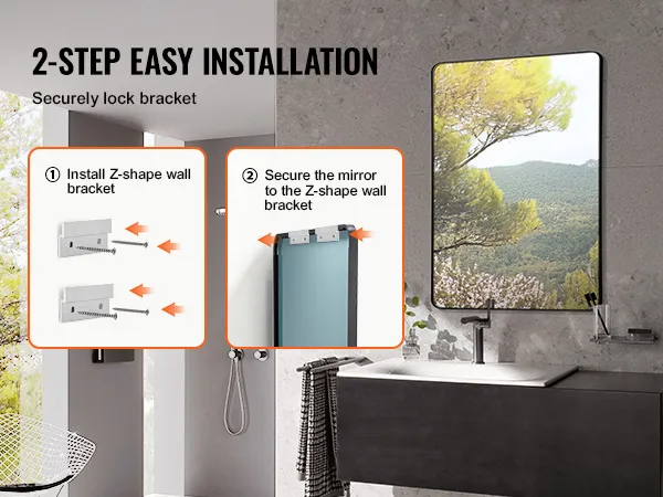 This wall mounted makeup mirror’s Z-shaped wall bracket streamlines installation, minimizing the need for pre-drilled holes or concerns about wall damage. With just two simple steps, it mounts securely in place.