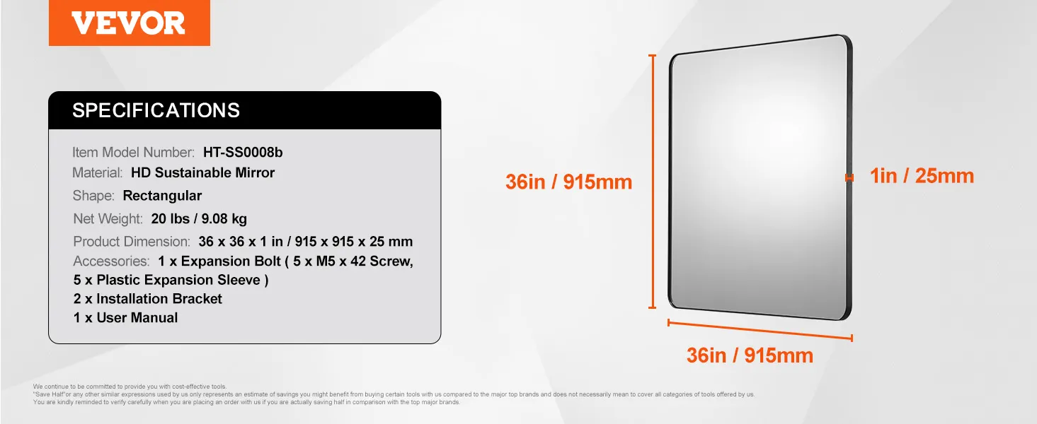 VEVOR Wandspiegel Make-upspiegel Badkamerspiegel 915 x 915 x 25 mm Zwart frame Gemaakt van aluminiumlegering Spiegel met Z-vormige beugel voor badkamer Slaapkamer Woonkamer