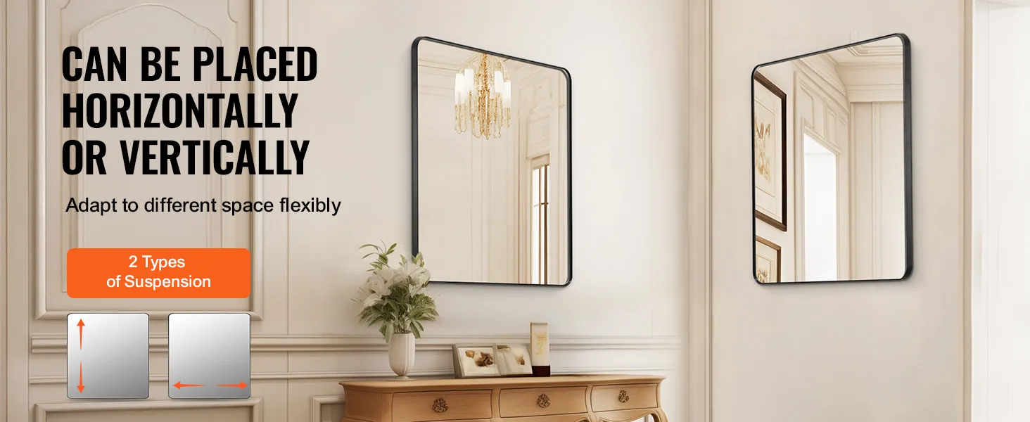 Het lichtgewicht spiegelframe van hoogwaardige aluminiumlegering is corrosiebestendig en behoudt zijn glans, zelfs in vochtige ruimtes zoals badkamers. Het biedt een lange levensduur en een strakke, moderne uitstraling.