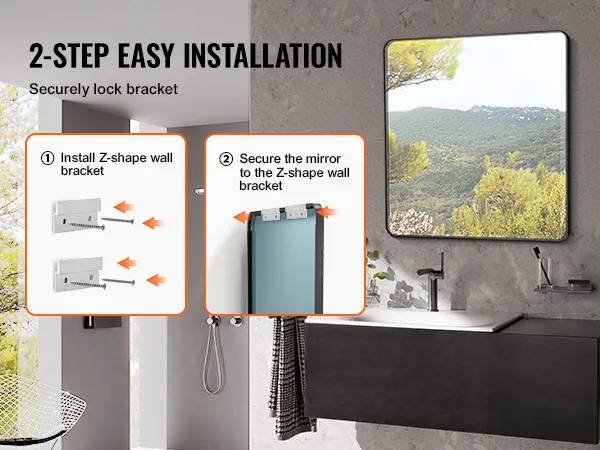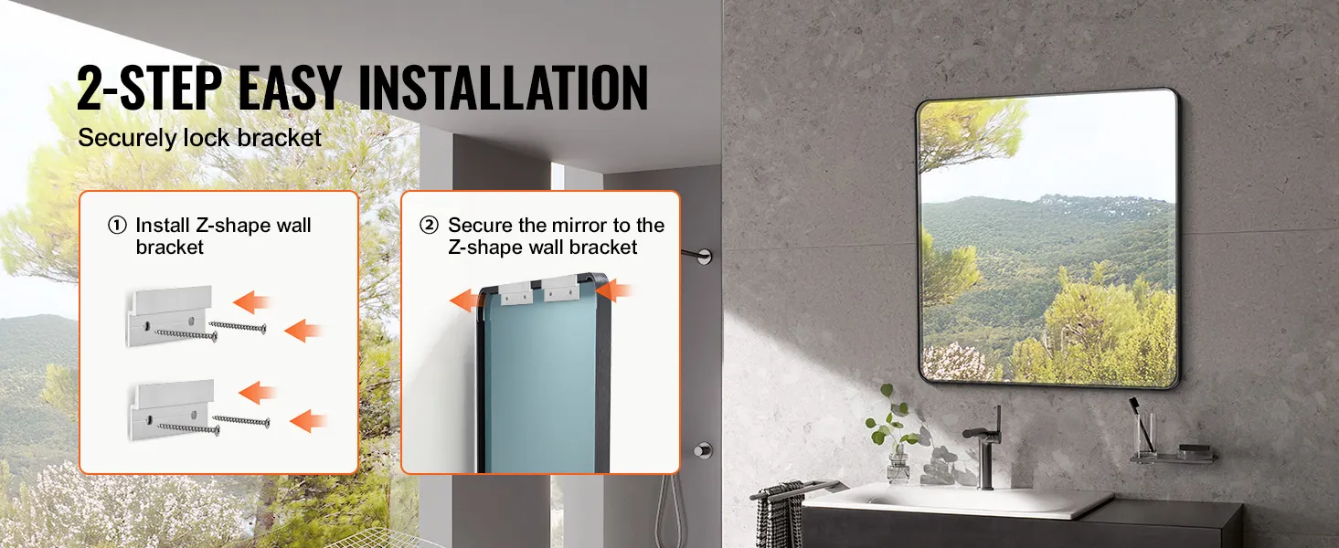 De Z-vormige muurbevestiging van deze aan de muur gemonteerde make-upspiegel vereenvoudigt de installatie en minimaliseert de noodzaak om gaten te boren of de muur te beschadigen. In slechts twee eenvoudige stappen wordt de spiegel veilig bevestigd.