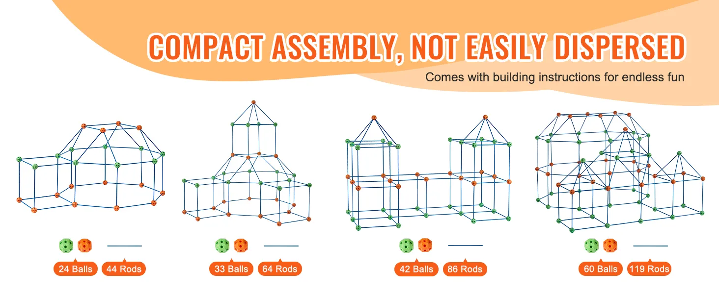 180-Piece Fort Building Kit: Explore endless possibilities with our kids fort building kit! It includes 60 solid balls and 120 lightweight yet durable connecting rods. Perfect for kids aged 4 and up to create their own 3D spaces—build forts, tents, pyramids, rockets, and more with parental guidance.
