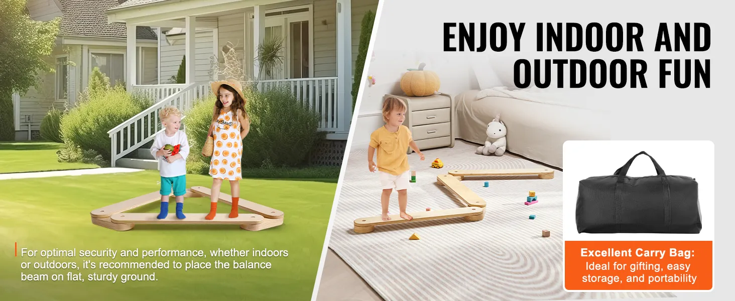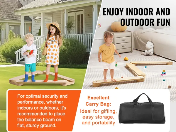 Portable Storage Bag: This toddler balance beam includes a high-quality storage bag for easy assembly and travel convenience. Ideal for indoor or outdoor use in places like the living room, backyard, or park, allowing quality bonding time for parents and kids. It's recommended to place the balance beam on a flat, sturdy surface for optimal security and effectiveness.