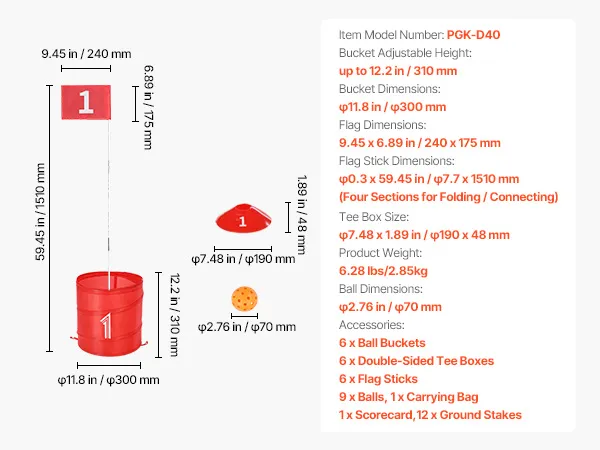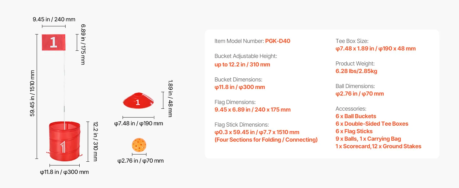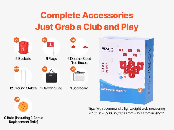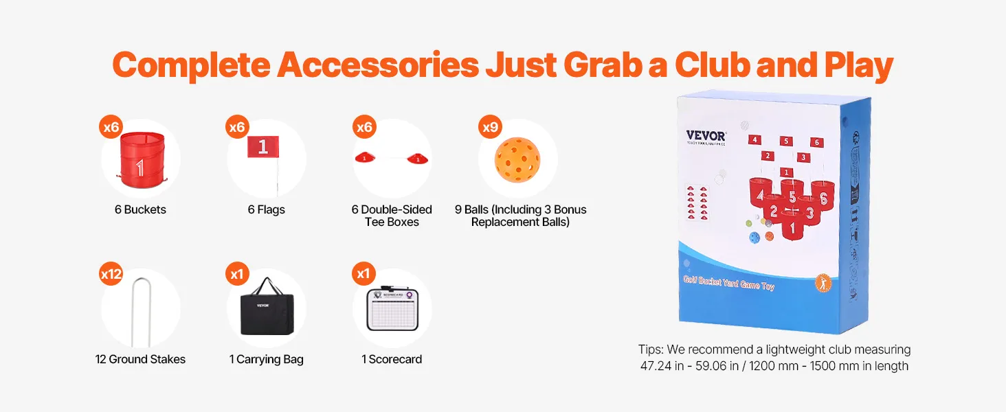 Het Bucket Golf-pakket bevat 6 holes, 12 grondpalen, 6 vlaggen, 6 dubbelzijdige tee-boxen, 9 ballen, 1 draagtas en 1 scorekaart, en biedt alles wat je nodig hebt voor een complete speelervaring.