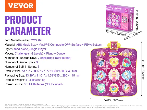 Diverse Gameplay: Unleash endless fun with 3 modes! Our dance mat features piano mode, dance mode (8 songs, 3 difficulty levels: easy, normal, hard), and challenge mode (8 exciting levels). You can proceed to the next level or stay at the current one after completing a challenge. Switch it up anytime for a fresh dance experience!