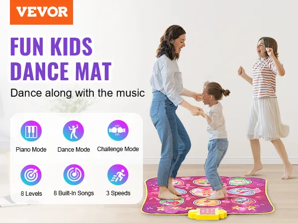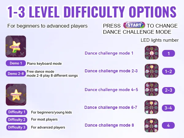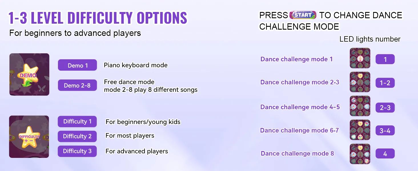 Our dance mat rocks 3 modes (piano mode, dance mode with 8 songs & 3 difficulty levels: easy, normal, hard, plus challenge mode with 8 levels). Switch up and groove to your mood!