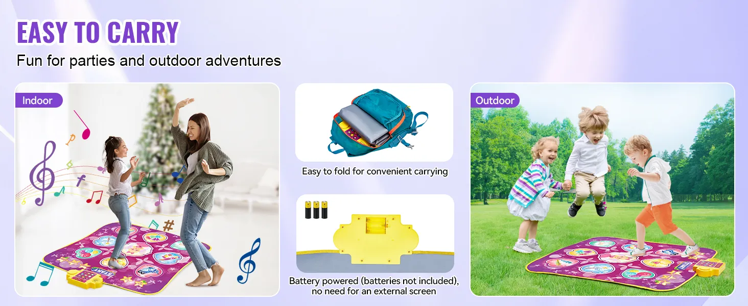 Easy to Store and Carry: Fold, go, and dance anywhere! Lightweight and soft, this dance pad folds neatly for easy storage, saving your space. With its wireless and portable design, it runs on 3 AA batteries (not included), so you can dance anytime, anywhere – no cords or hassle!