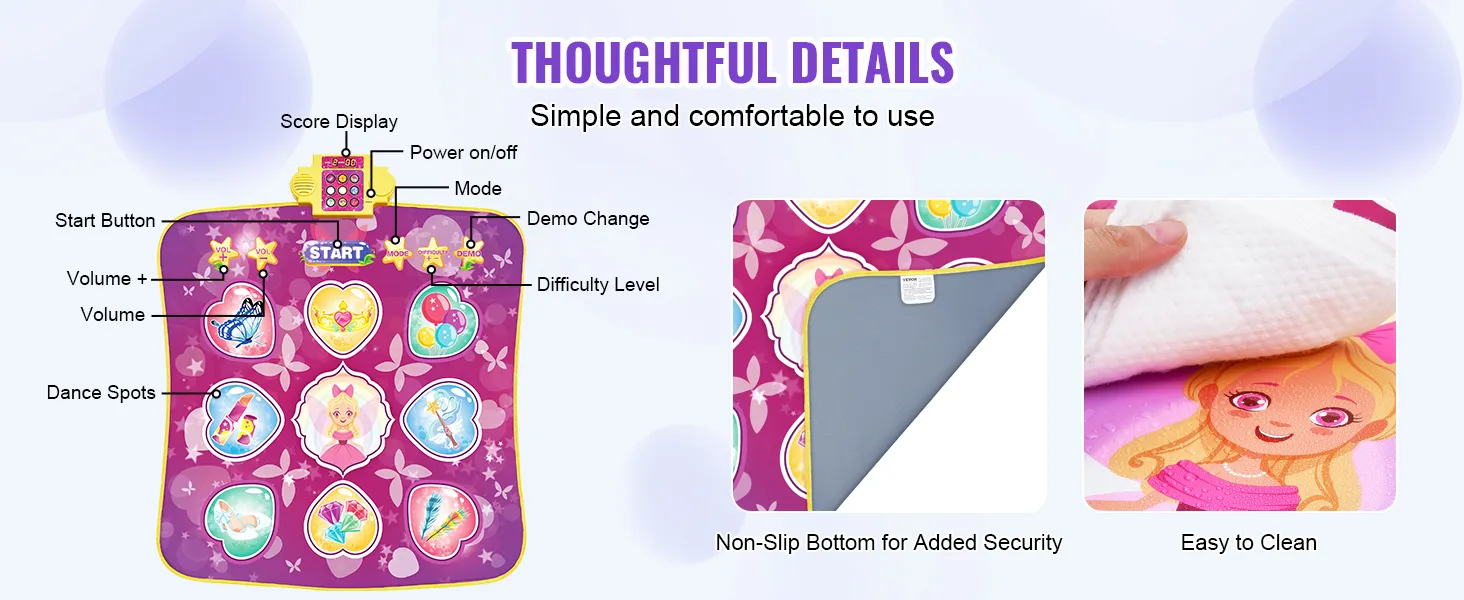 User-friendly and intuitive, our dance pad is easy for even little ones to understand and play. Made from durable vinyl with a PE-composite OPP surface, it's sturdy and long-lasting. A non-slip PEVA bottom keeps it in place so you can focus on the fun!