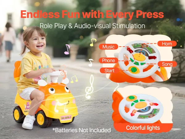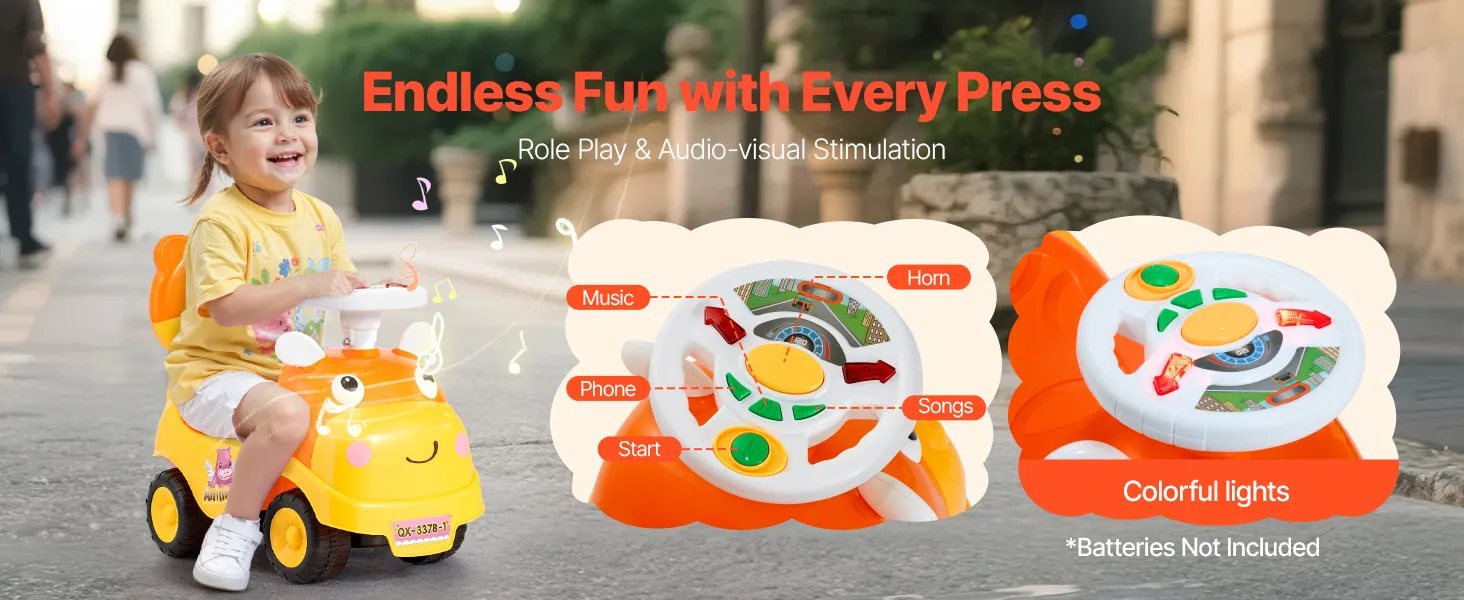 Rijplezier: Het stuur van de loopauto produceert claxon-, muziek-, telefoon- en motorgeluiden, waardoor de interesse in rollenspellen wordt gestimuleerd en de hand-oogcoördinatie wordt verbeterd.